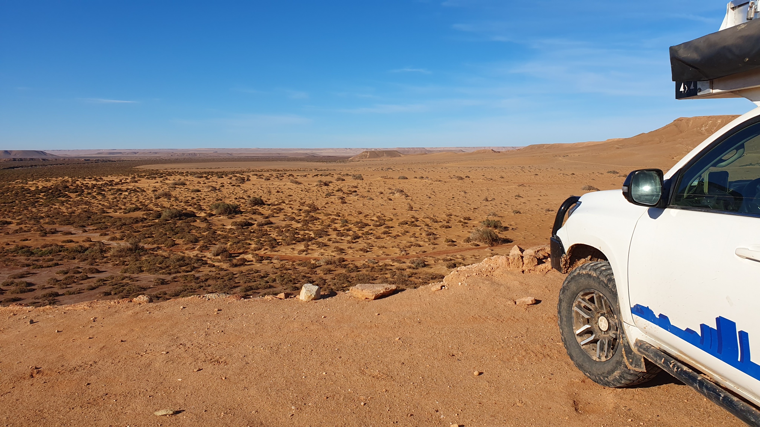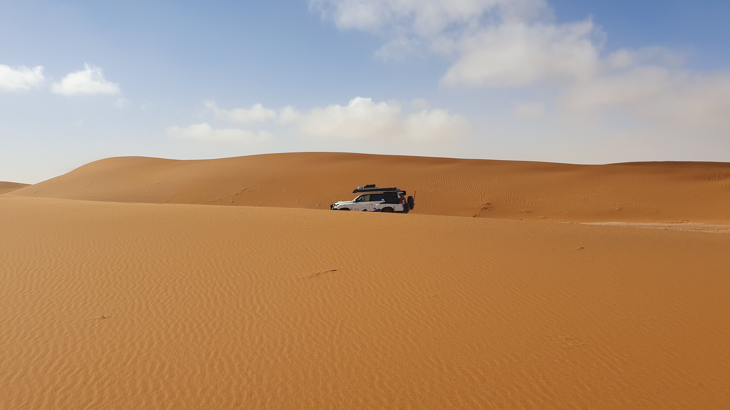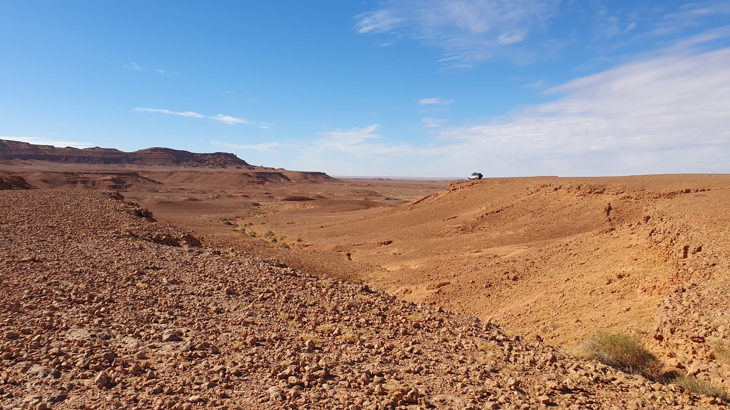 Das etwa 150 km² große Gebiet der maximal etwa 80 bis 100 m hohen Sanddünen des Erg Chegaga befindet sich etwa 50 km westlich von M’hamid El Ghizlane bzw. etwa 50 km südöstlich von Foum Zguid unweit der nicht exakt definierten Grenze zu Algerien. Die menschenleere Region ist nur mit Geländewagen oder Kamelen/Dromedaren erreichbar. Bewegt man sich Östlich dieses Wüstengürtels ist man mit einem Bein im "Knast" oder zumindest im Algerischen Einflussbereich. Die nächsten Tage werde ich wohl keine Menschenseele mehr sehen.