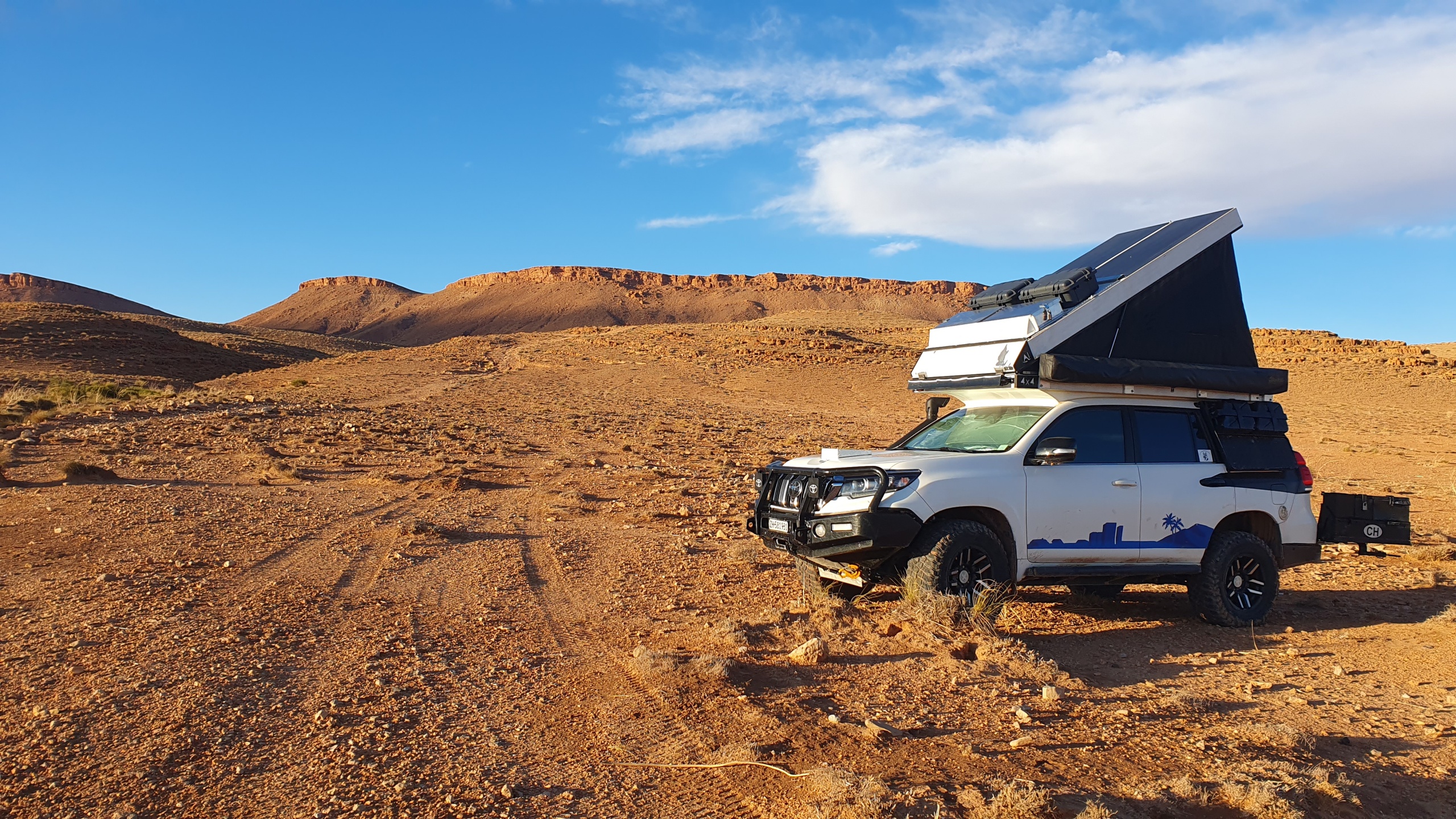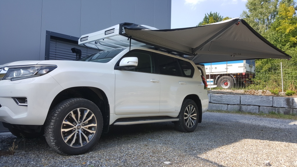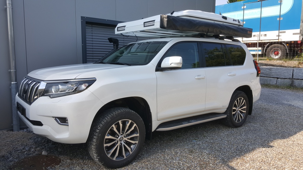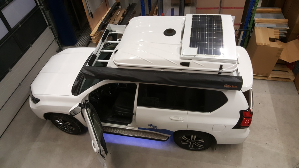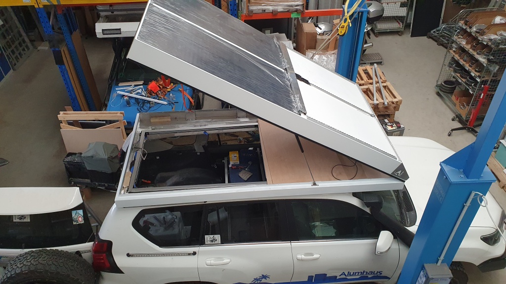 Das Original Dachzelt von James Baroud wird mit einer zusätzlichen Alukiste zur Aufnahme eines Solarpanels und zusätzlichem Stauraum aufgerüstet.