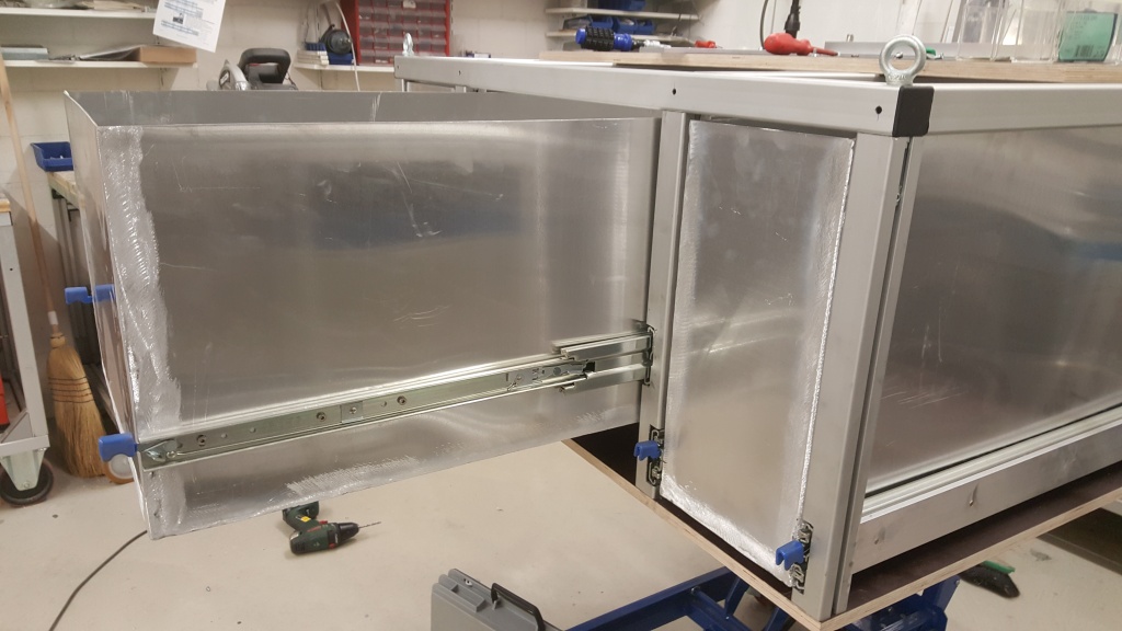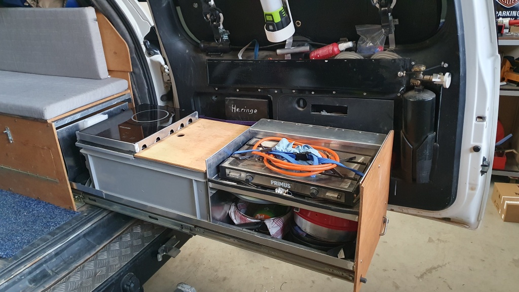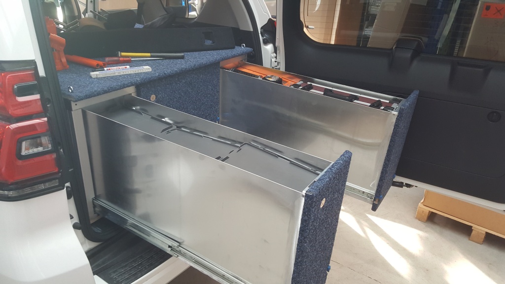 Konstruktion eines Einbauschrankes mit 3Stk. Auszugsschubladen für Werkzeug, Haushaltgeräte und Notausrüstung. Die gesamte Konstruktion kann mit wenigen Handgriffen aus dem Fahrzeug entfernt werden. In einer ersten Phase wird die Rückbank im Fahrzeug belassen um das Fahrzeug auch als Familiengefährt nutzen zu können.