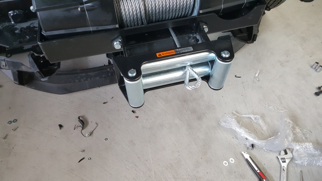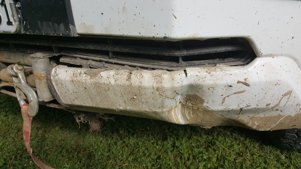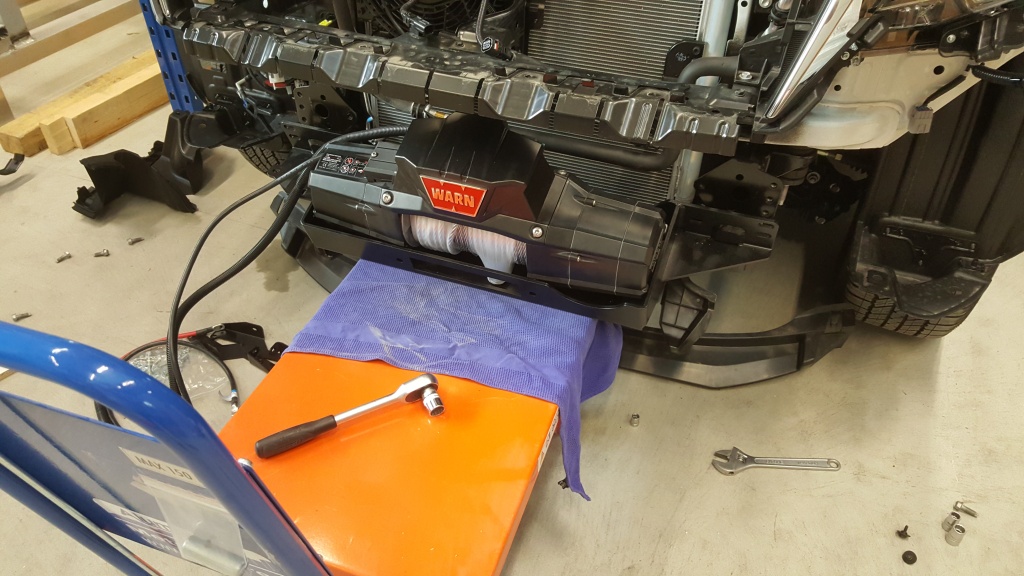 Demontage der Fahrzeugfront um Platz für eine Stahlplatte für eine kräftige Seilwinde zu schaffen.