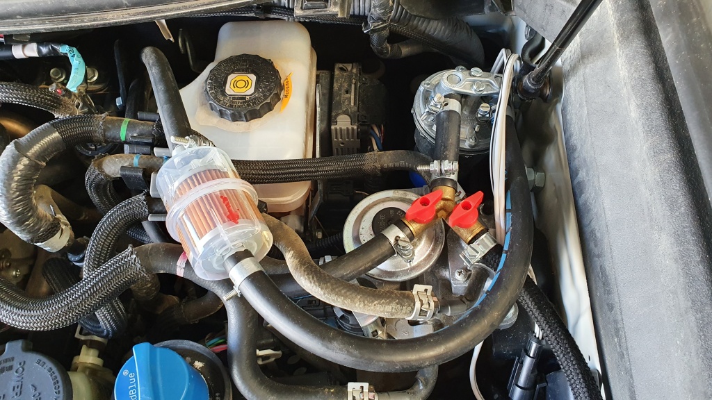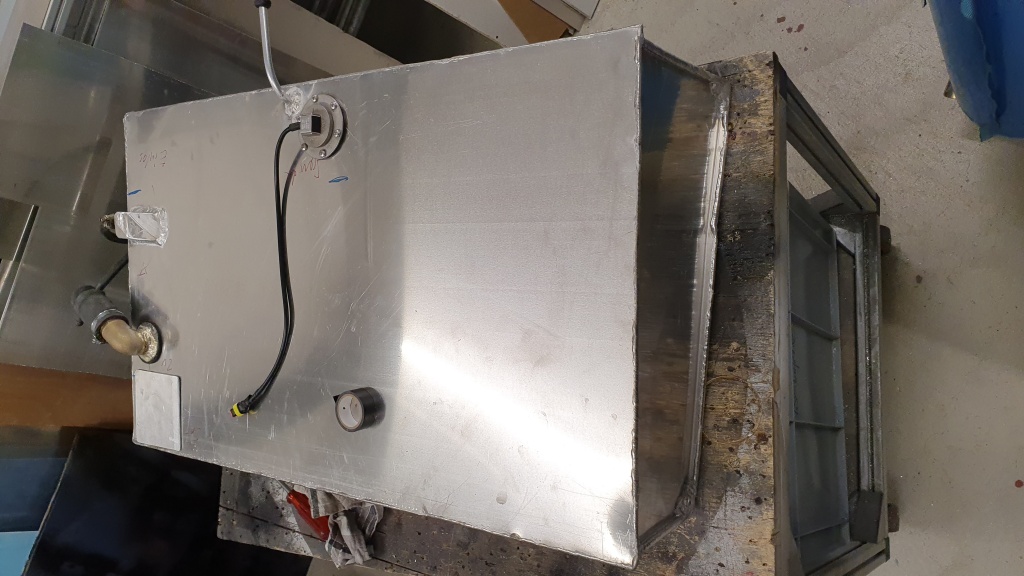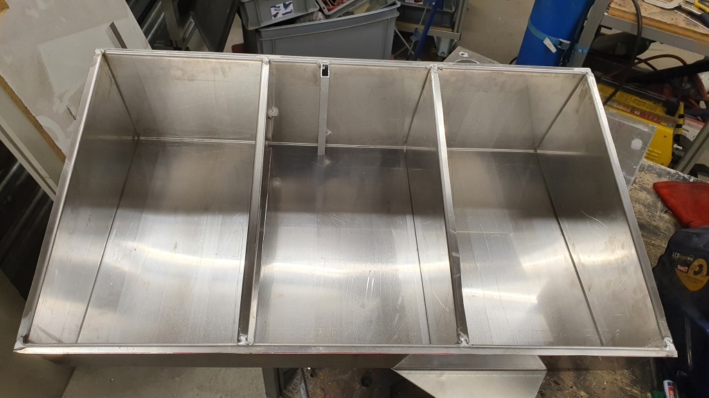 Aluminiumkonstruktion mit Schwallblechen, Zulauf, Entlüftung und Notablass. Durch die zusätzlich verbaute Druckpumpe lässt sich der Diesel aus dem Zusatztank (80Liter) auch während der Fahrt in den Haupttank pumpen.