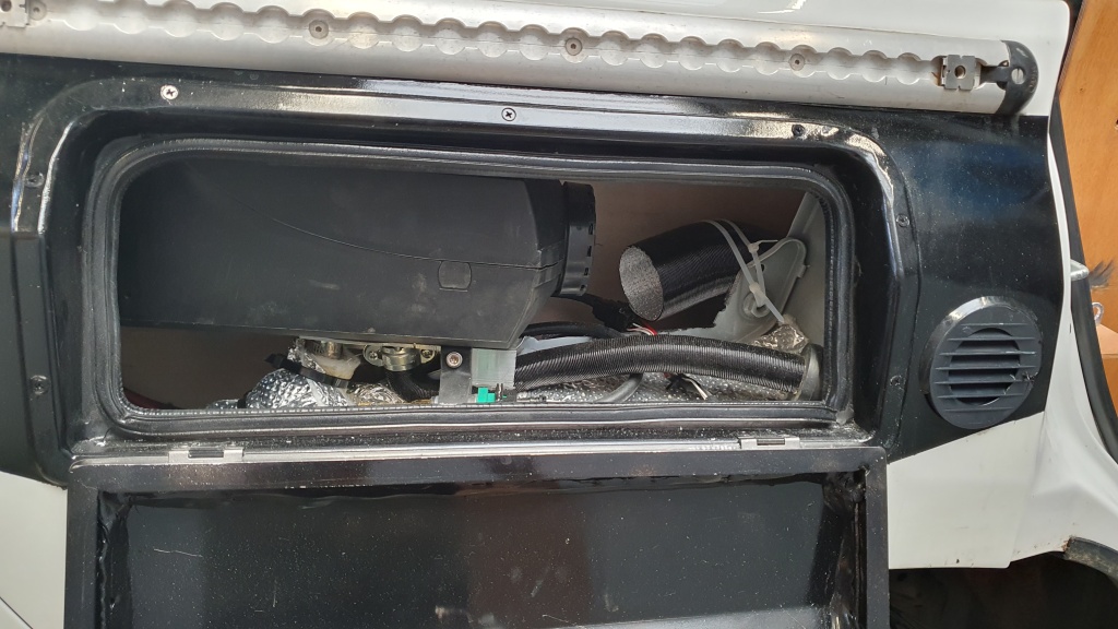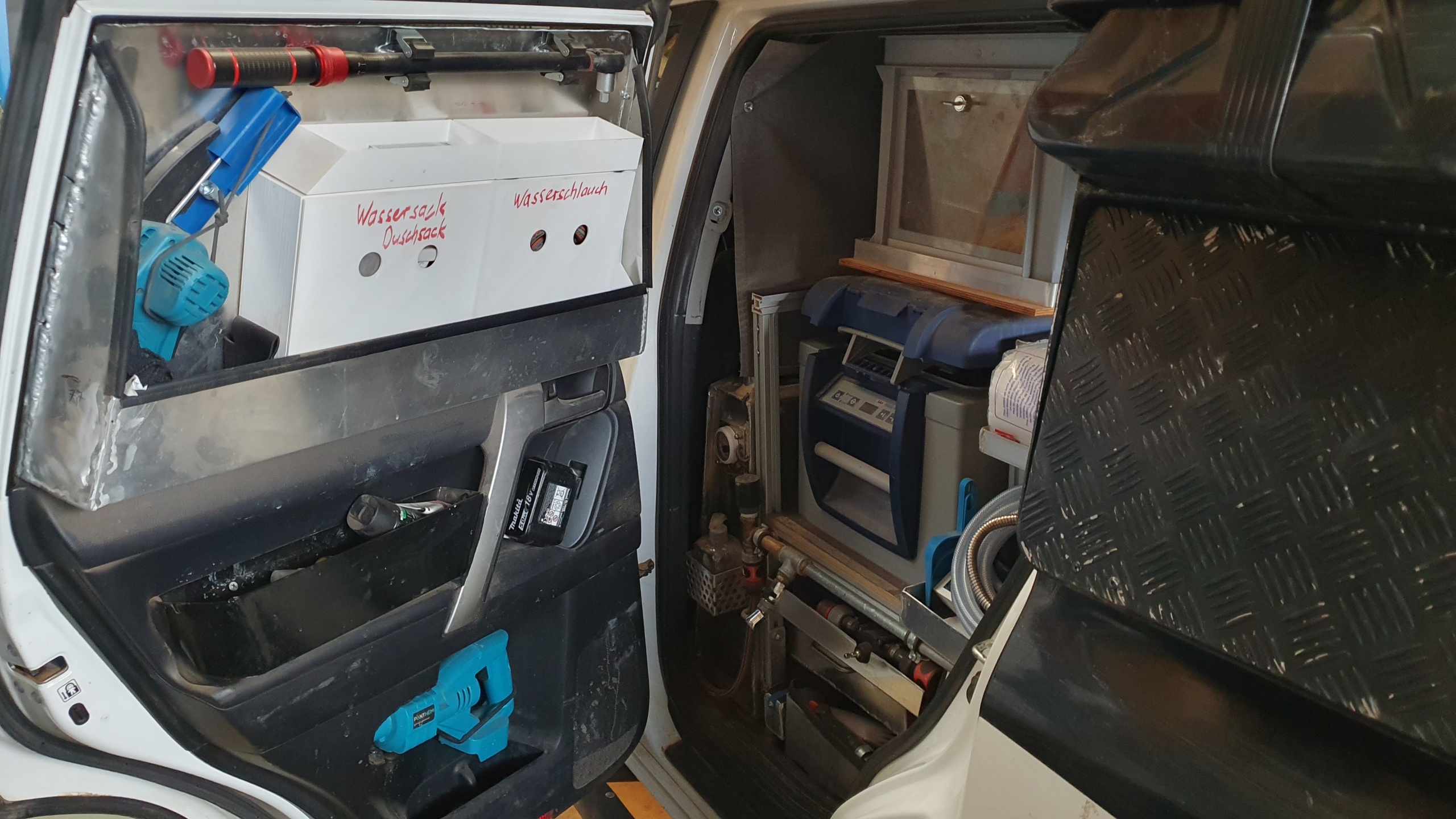 Hinter dem Fahrersitz ist ein 50Liter Frischwassertank und die 45Liter Kühlbox.