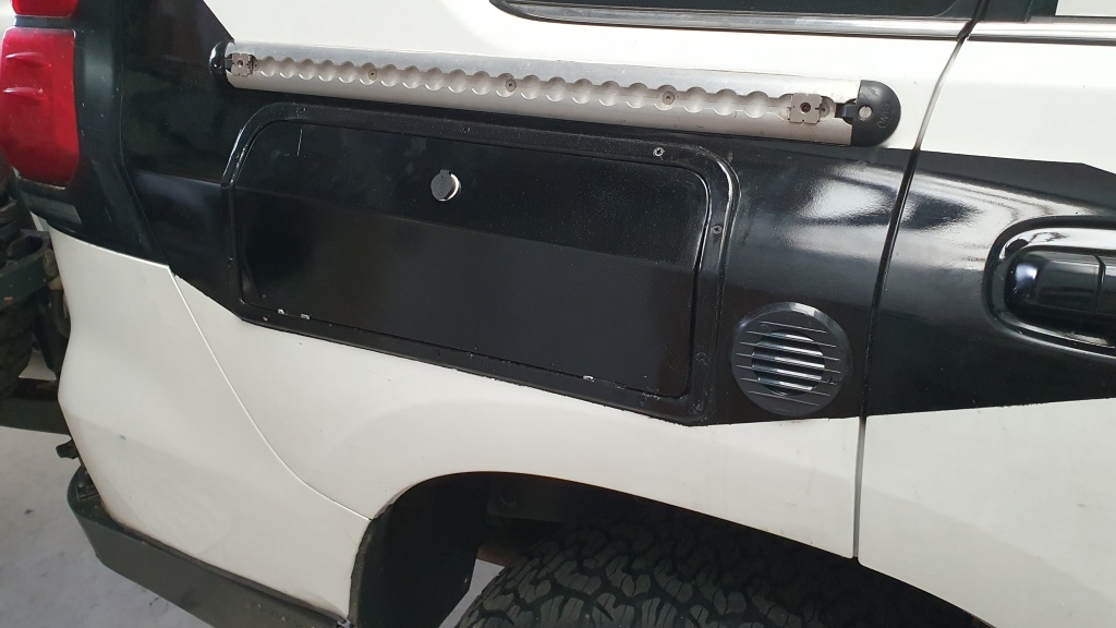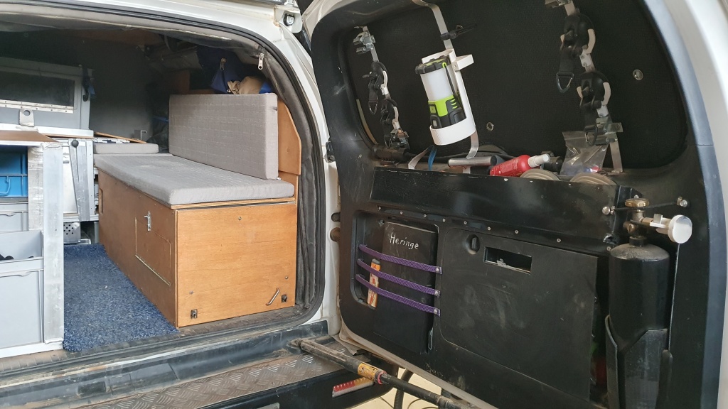 Durch die Fahrwerkserhöhung ist der Heckeinstieg zur Kletterpartie geworden, darum habe ich eine demontierbare Zweistufenleiter aus Aluminium "gebruzelt". Die hinteren Türen wurden durch zusätzliche Ablagemöglichkeit erweitert. Ein schneller Zugriff für die Campingstühle und Tisch sind optimal verstaut.