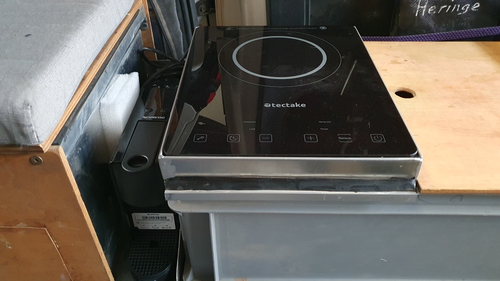 Sitzbank mit integriertem Vollauszug. Gaskochstelle mit 2 Flammen, Induktionsherd, Kaffeemaschine, Pfannenablage. Hecktürverkleidung mit Gasflaschenhalter und div. Ablagemöglichkeiten.